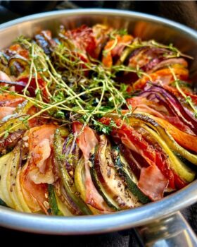 de laatste 10 min zet je de oven op de grillstand en voeg je na ieder plak aubergine een kwart plak Jambon cru (8 weken gerijpt) toe