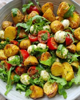 De aardappelen uit de oven halen en even laten afkoelen. Vervolgens vermengen met de kerstomaatjes, mozzarella, rucola, bieslook en pestodressing. Bon apetit!